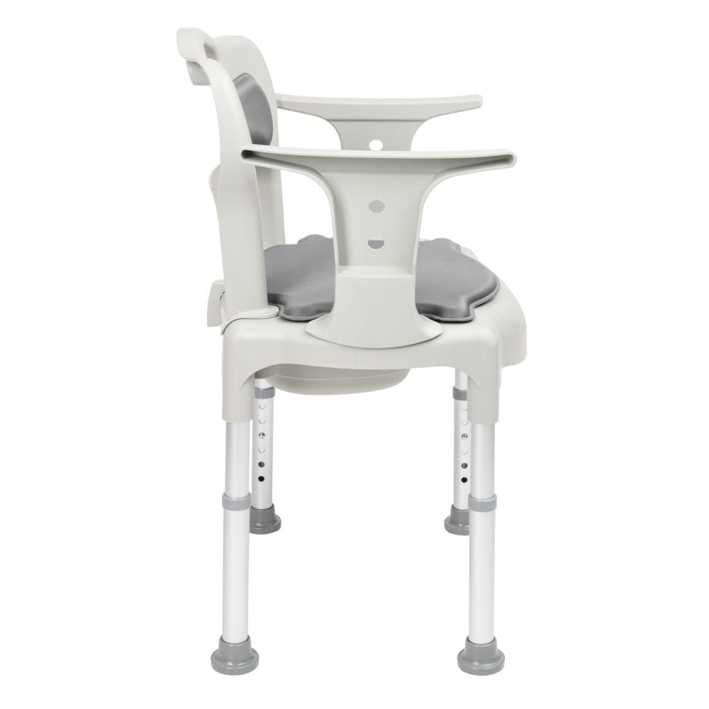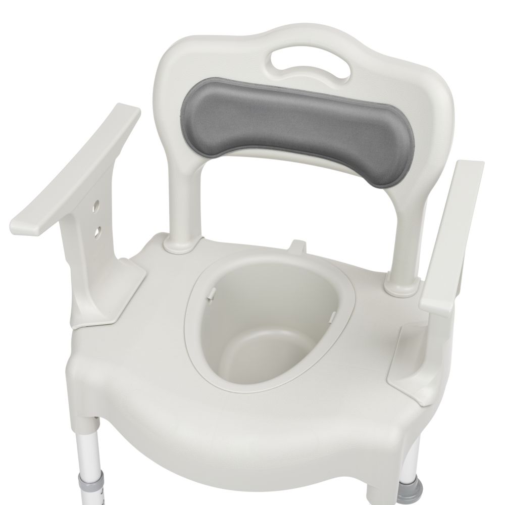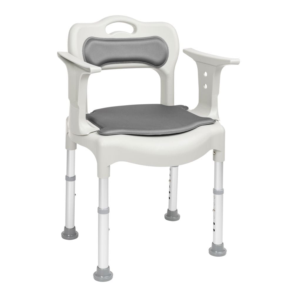 Siedzisko i oparcie wyposażono w miękkie, zdejmowane poduszki, które podnoszą komfort podczas siedzenia. Podłokietniki ułatwiają zachowanie równowagi oraz wspierają użytkownika przy wstawaniu i siadaniu, co jest szczególnie istotne dla osób z ograniczoną sprawnością ruchową.